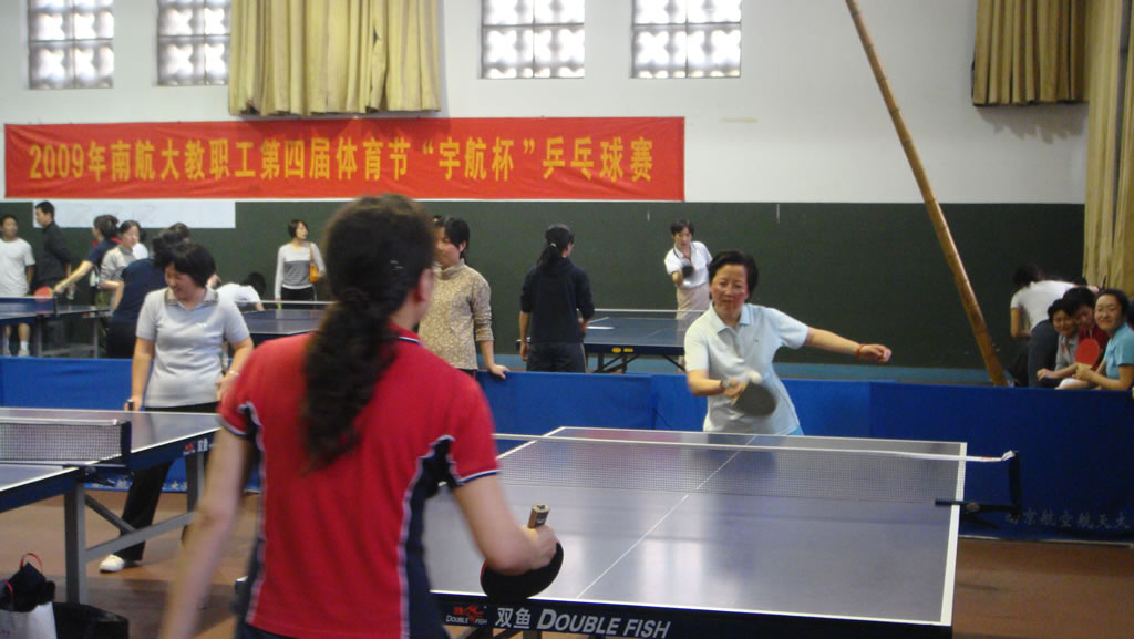 经过一周艰苦的拼搏,我院女队荣获2009年南航大教工第四届体育节“宇航杯”乒乓球比赛第五名的好成绩。图为我院女队主力,姜翠秀老师在“奋力拼杀”