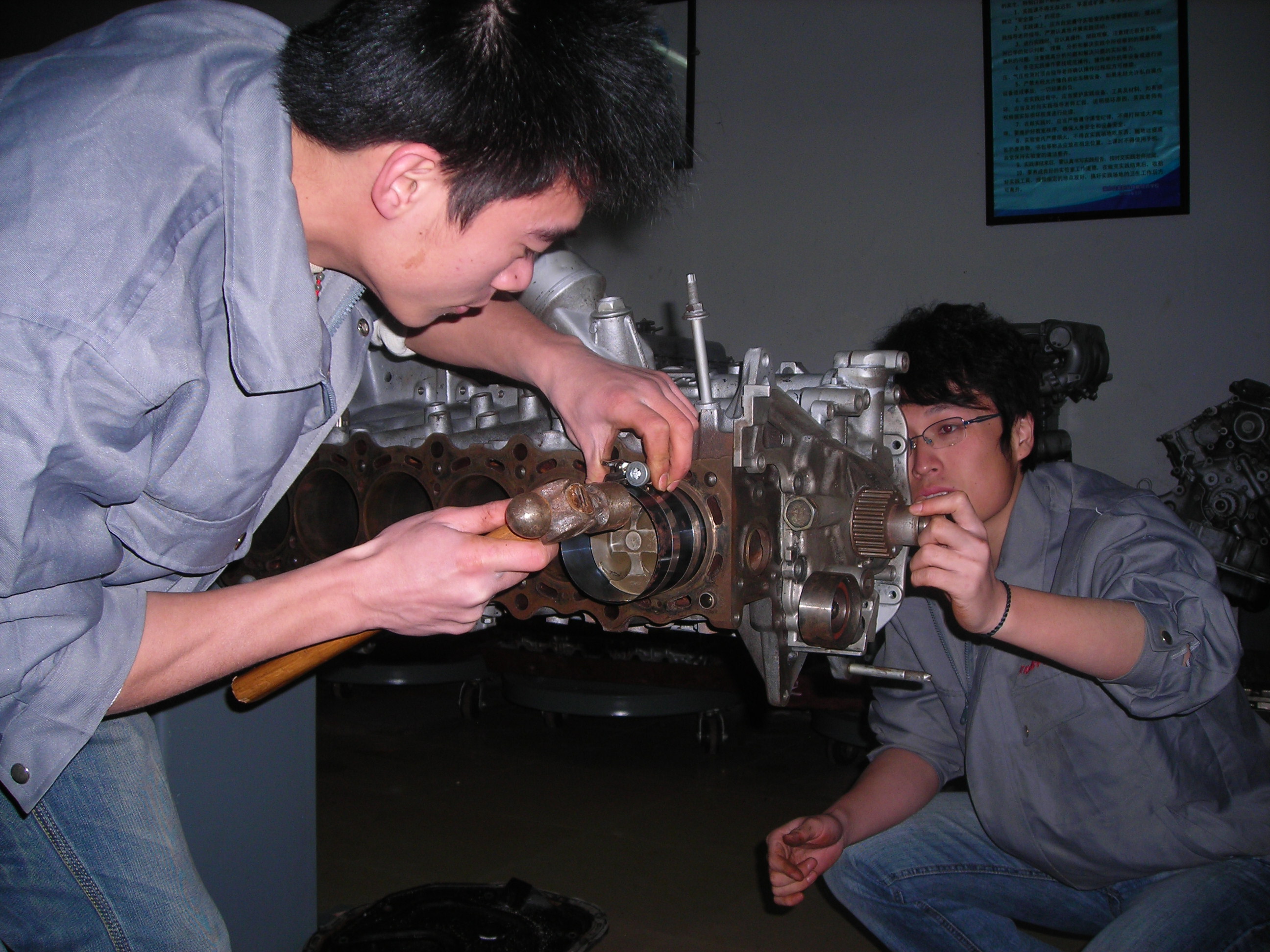 比赛中表现最突出的还属发动机大修工位,由于是要接到维修单才能开始维修,所以同学们在还没有接到维修单的时候都比较紧张,一边讨论问题一边翻看书页但随着派工单的到来同学们的情绪一下高涨起来了,在看过派工单上的故障现象是烧机油后各个拎起工具箱跃跃欲试。在操作过程中同学们有的负责整理工具、有的负责拆卸、有的负责摆放零件,一时间工具的碰撞声,零件的摆放声不绝于耳。当发动机解体后,同学们开始检测缸径,测量活塞环三隙一步步都十分稳健,俨然一副老技师的样子。检测后,同学们发现问题出在活塞环上便开始清洁活塞更换活塞环。经过一番努力同学们将发动机修复完毕,随后经由大赛请来的特约评判