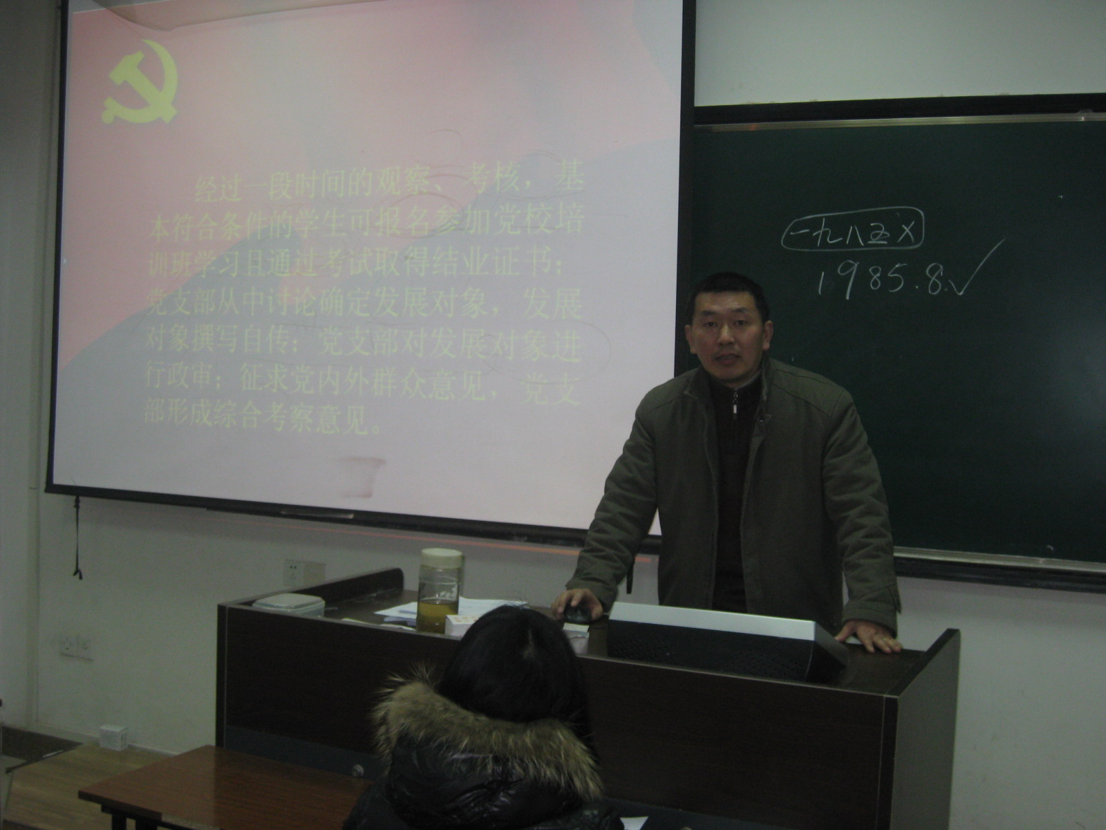 为进一步加强学生党建工作,推进我院学生党建工作的科学化、制度化和规范化,3月16日下午我院学生管理办公室在A-10号楼423室举行学生党建工作讲座,邀请我院党委委员秦颇老师作《学生党员发展程序》专题讲座。 秦颇老师翔实地讲解了学生党员发展的流程,并就如何正确规范地填写《入党积极分子、预备党员教育考察表》,向在场的班主任、辅导员作了详细的说明。