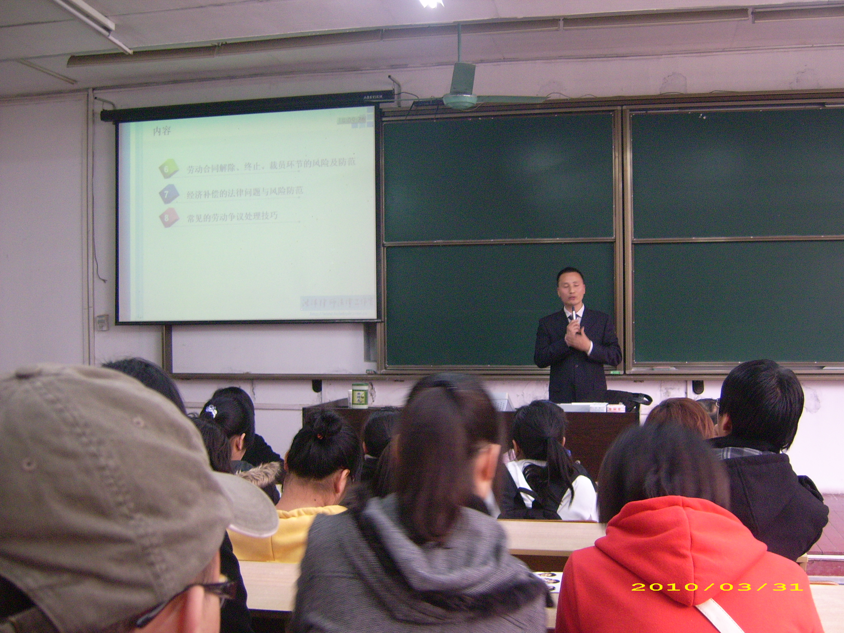 本次讲座从我院学生的实际情况出发,通过生动翔实的案例,对用人单位在签订劳动合同的过程中可能出现的各种风险如何作出防范进行了宣讲。本次讲座,大大提高了学生的维权意识,对学生们进入社会后如何维护自身合法权益有了初步的指导。(殷娟)