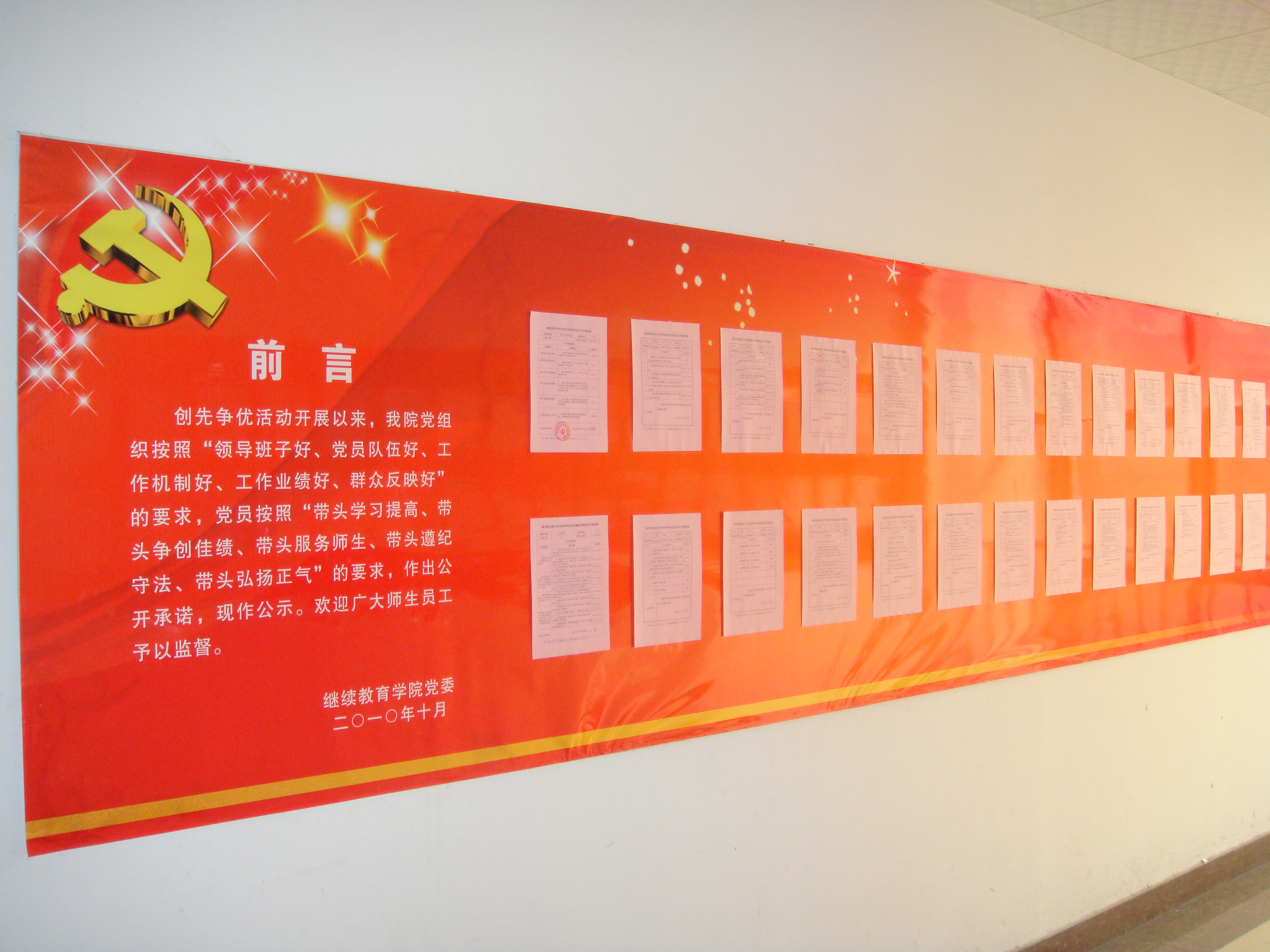 创先争优活动开展以来,红是一世手机版足球网党组织按照“领导班子好、党员队伍好、工作机制好、工作业绩好、群众反映好”的要求,党员按照“带头学习提高、带头争创佳绩、带头服务师生、带头遵纪守法、带头弘扬正气”的要求,分别做出公开承诺。各党支部组织党员交流公开承诺事项,并结合支部实际,确定了支部的公开承诺事项。学院党委特别设计了公示栏的布局,务求做到美观、大方、庄重,现在10号楼公示,欢迎广大师生员工监督。(王勇)