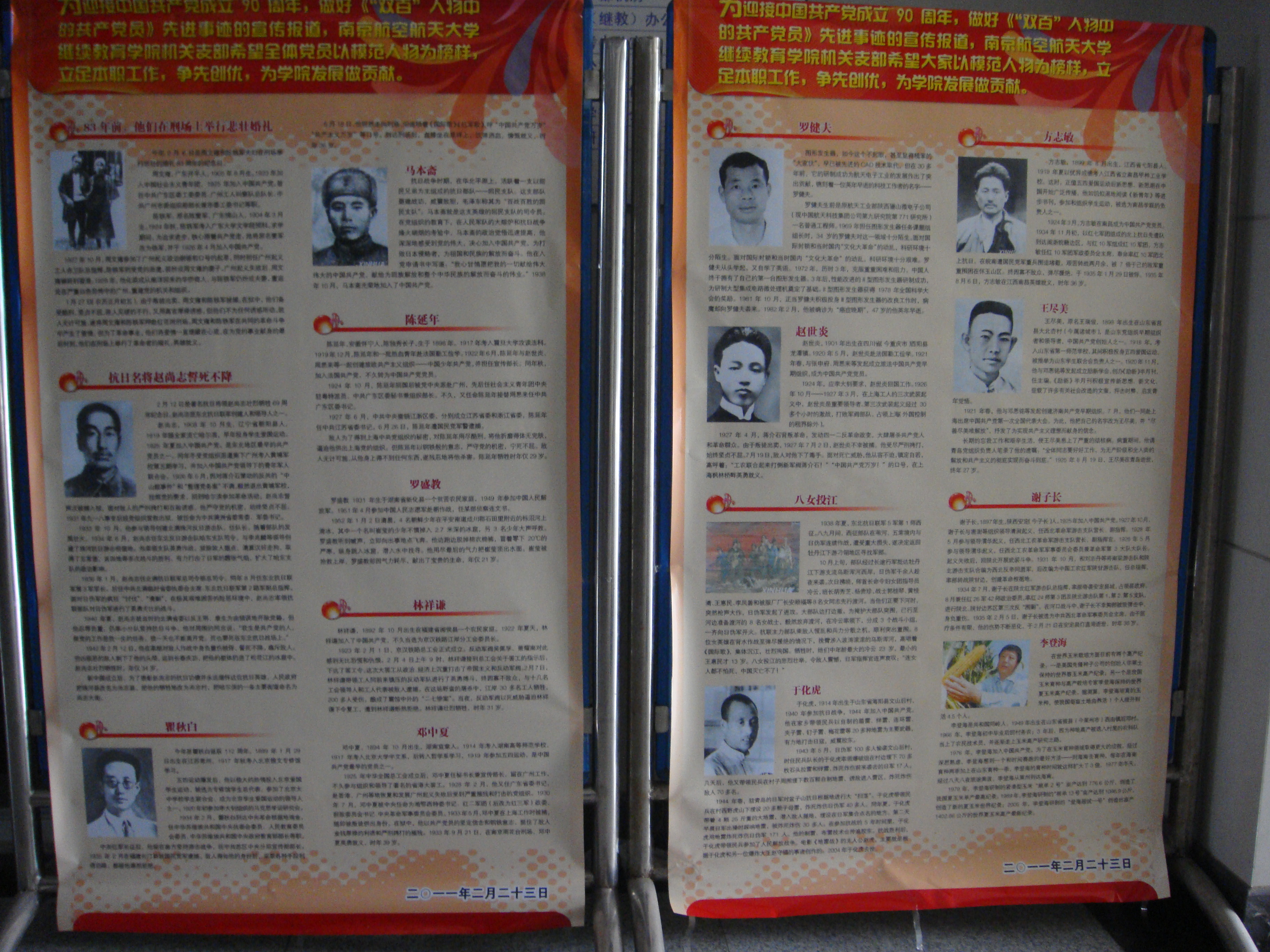 近期,为了庆祝中国共产党建立90周年,推进“创先争优”活动深入开展,学院机关党支部将“双百”人物事迹制成展板,在十号楼大厅进行了展出。