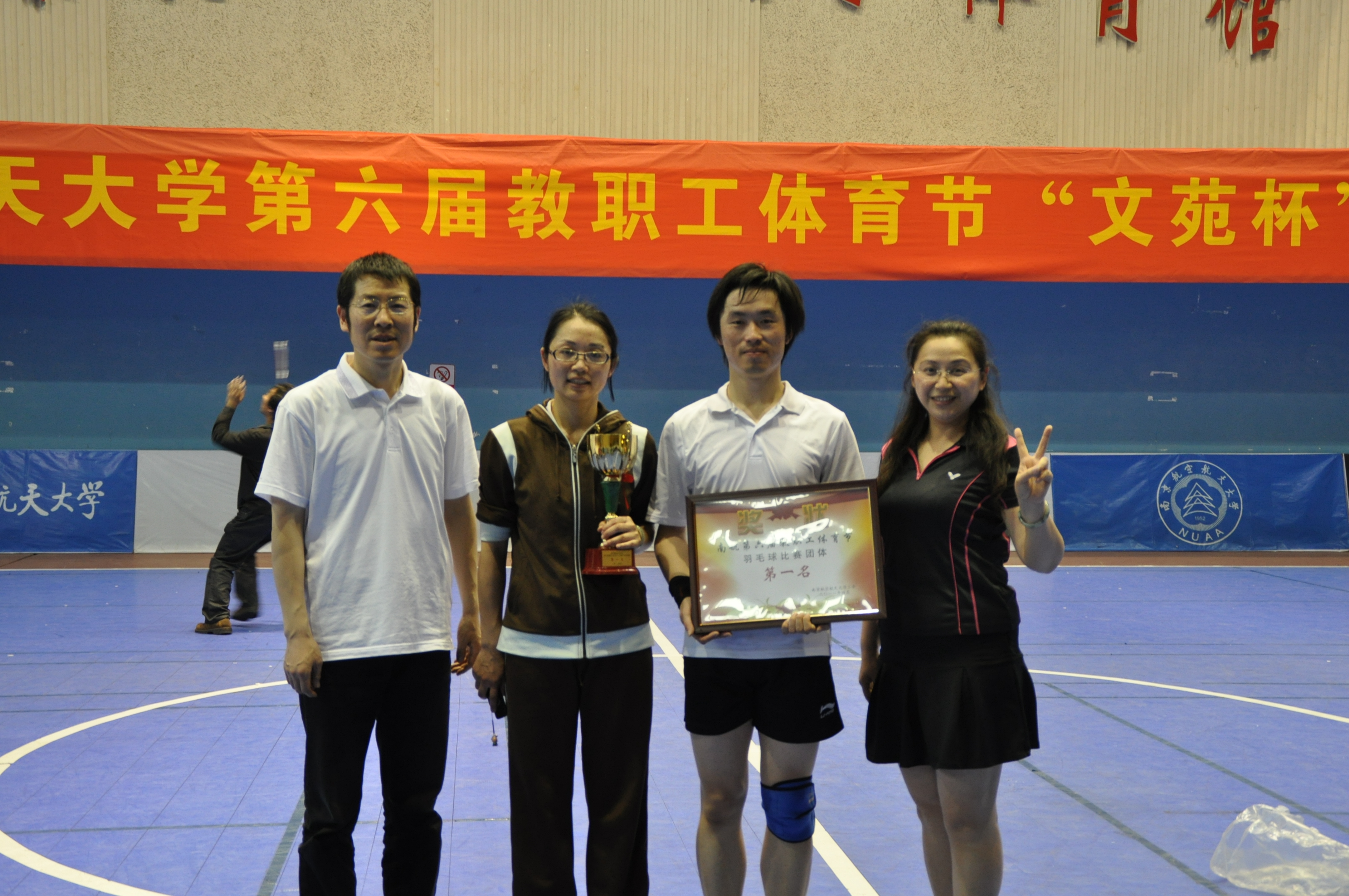 老师组成的我院教工羽毛球队,经过奋力拼搏,团结协作,勇夺学校第六届教职工体育节羽毛球团体比赛第一名。(王勇)