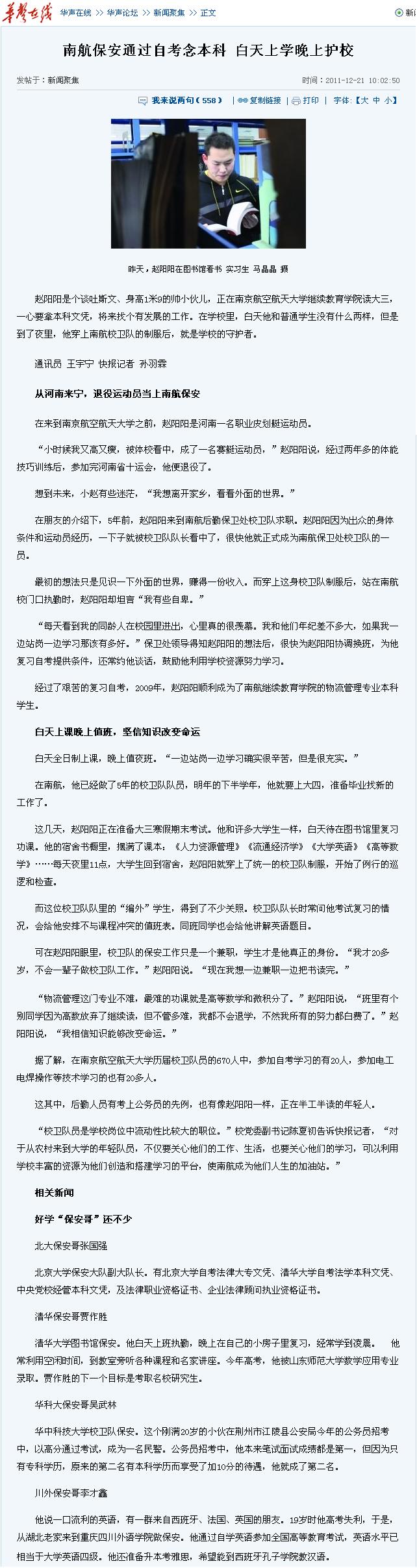 华声在线:南航保安通过自考念本科 白天上学晚上护校