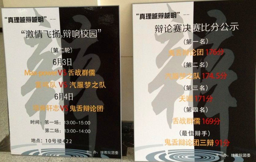此次辩论赛共有15支队伍报名参加,经过海选、复赛,最终“鬼舌辩论团”以176分获得第一名,其三辩获得“最佳辩手”,“汽服梦之队”和“天翊”分获二三名。(撰稿 刘艺丹)