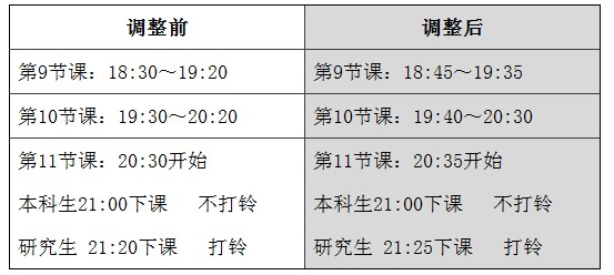 根据学校教学工作整体安排,经研究决定从3月3日起,对本学期晚间上课时间进行如下调整: