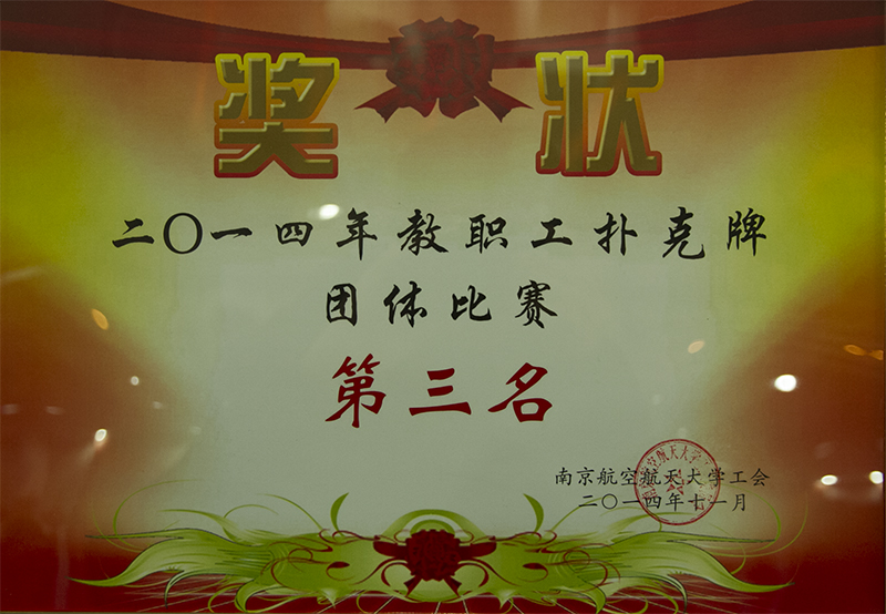 12月6日,学校工会举办“2014年教职工扑克牌”比赛,它是学校丰富教职工业余生活的一种方式,学院部门工会认真组织,积极参与,由学院工会副主席王勇老师任领队,由郑骏、黄超峰、封娟、余江波四位老师组成的队员参加了比赛。
