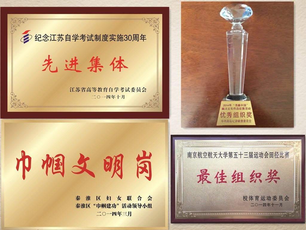 2014年,我院获得“江苏省高等教育自学考试先进集体”称号,黄山同志获得“先进个人”称号。自学考试部被评为“南京市秦淮区巾帼文明岗”。
