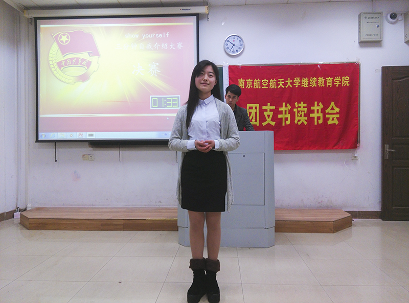 2015年4月9日晚,由学院团委主办,院团支部读书协会承办的学院首届“show yourself”三分钟自我介绍大赛决赛在明故宫校区10-319教室进行。校图书馆导读馆员王茜老师,学院团委书记黄超峰以及学院学生辅导员担任本次决赛评委。