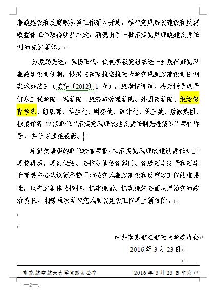 我院被学校评为2014-2015年度落实党风廉政建设责任制先进集体