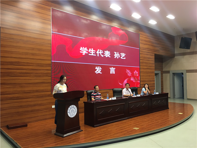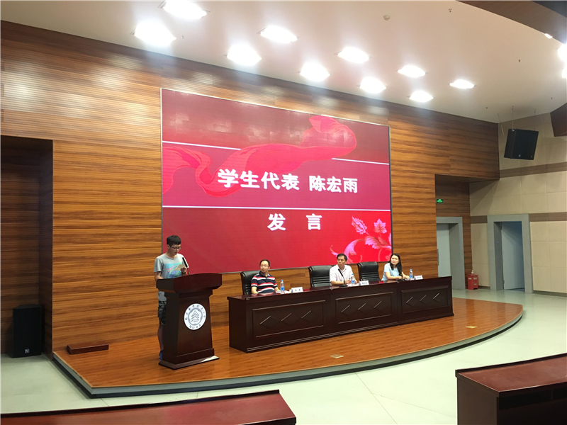 2016级新生陈宏雨和孙艺两位同学代表新生发言。陈宏雨同学和大家分享了他从寻找梦想到选择南航的心路历程以及渴望在南航这个舞台圆梦的信念;孙艺同学分享了她入校以来的感受,通过几天的校园生活,特别是在参观完校史馆和航天馆,对学校的历史和成就有了更进一步的了解之后,她明白了大学不仅仅是个人简简单单的学习与生活的场所,肩膀上还承载着作为一个“南航人”的责任。