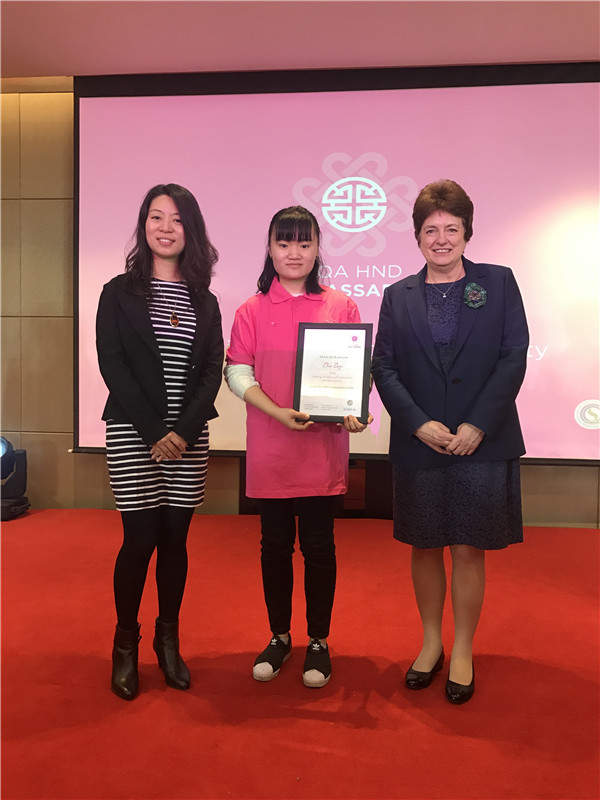 秦岚女士回顾了双方多年来共同举办的精彩活动,以及项目在发展过程中取得的优异成绩,她希望获奖同学能够严格要求自己,刻苦学习,修身养性,用自身的荣耀和精神去感染身边的同学,鼓舞身边的同学。用优异的成绩、优良的思想道德品质、健康的体魄回报给父母、回报母校,把握在HND学习的机会,更好的迎接挑战、为自己的美好未来发愤图强,成为品学兼优的国际化人才。