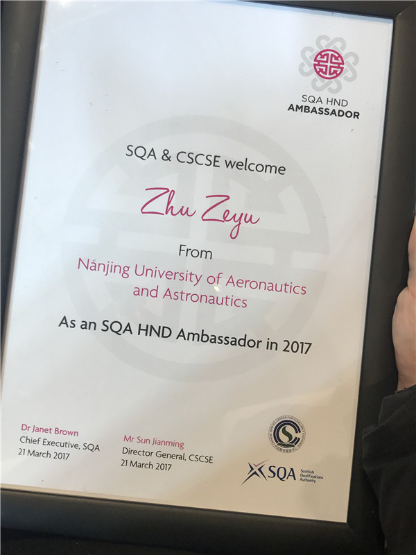 2017年3月21日下午,SQA HND项目优秀学生评选活动“SQA HND理想大使”颁奖典礼在北京北辰洲际酒店举行,我院朱泽宇同学荣获“SQA HND理想大使”称号。