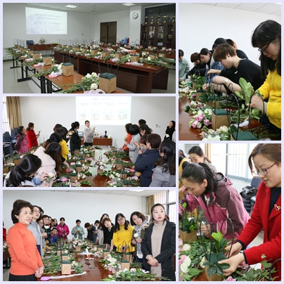 3月16日下午,学院特邀南京HEY.U花艺培训机构的王瑟老师为大家授课,王老师先向大家普及了花艺常识,帮助大家提高鉴赏水平,接着边讲边示范,手把手教大家如何选择、搭配花种,如何错落有致插花。大家认真地边学边做,在老师的指导下,琢磨花篮里的花如何更美、更有创意,经过自己辛勤地摘插,手里的鲜花像变魔术似的一朵朵有了灵气。一盒盒鲜花,收获的是满屏发自内心的幸福。