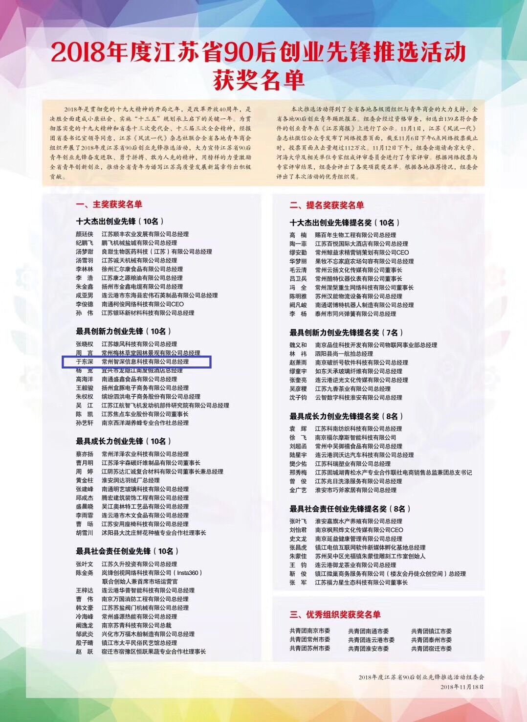 我院学生于东深喜获“2018年度江苏省90后创业先锋”荣誉称号