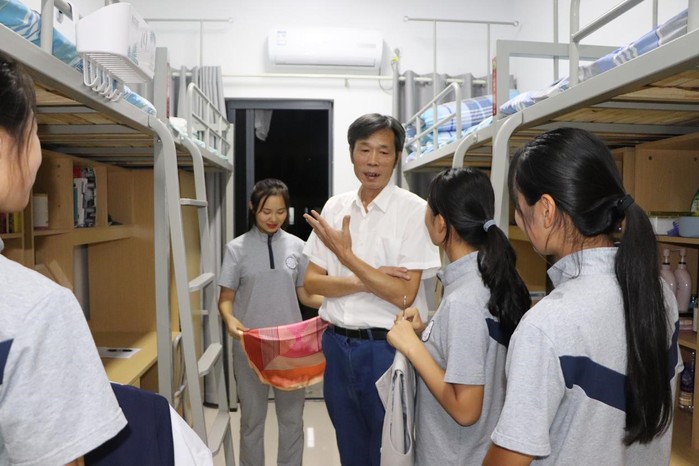 会议结束后,各宿舍学生代表分别前往男生示范宿舍、女生示范宿舍,共同学习了半军事化管理宿舍内务规范。