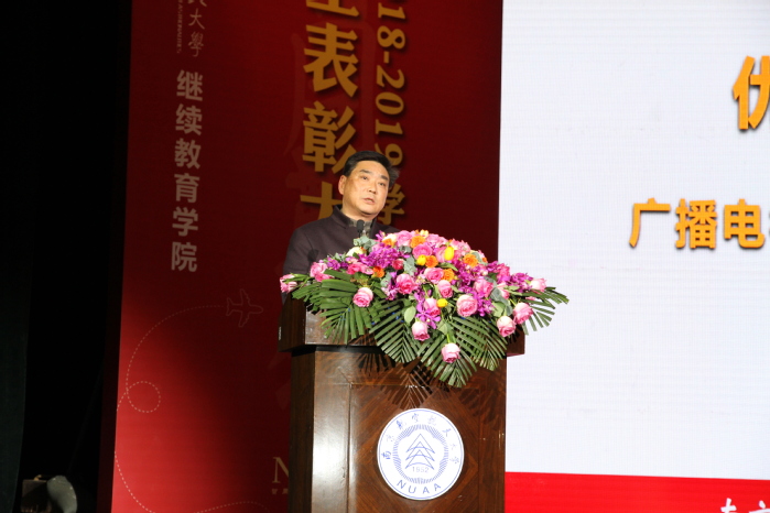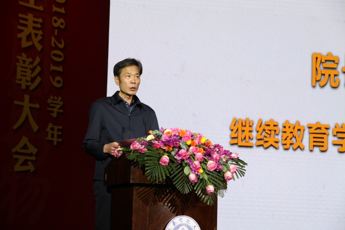 获奖学生代表事迹分享结束后,杜传锋发表讲话,向受到表彰的先进集体和个人表示祝贺、向辛勤工作在教育教学一线的广大教师和全体教职工表示感谢。他结合“努力办好继续教育事业,助力学校‘双一流’建设”的初心,通过分享校友师生榜样的事迹,从“志存高远,做奋斗者;坚守信念,做追梦人;勇于创新,做实干家”三个方面的鼓励同学们学习身边的榜样,汲取前行的力量,珍惜荣誉、奋发有为,努力为实现中华民族伟大复兴的“中国梦”作出自己的贡献!