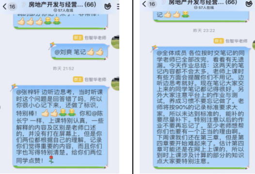 13:30,包老师开始批改同学们提交的《房地产开发与经营管理》课程作业,抽查同学们的听课笔记,对每个同学作出评价与反馈,并对班级整体学习状况作出总结。