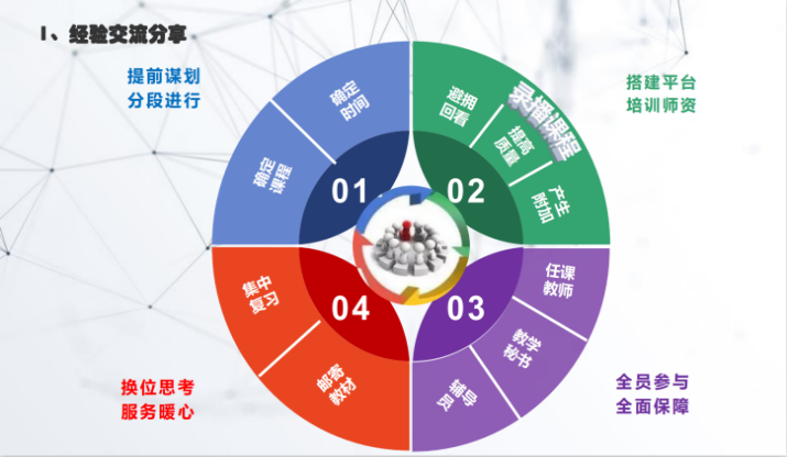 赵院长从提前谋划、分段进行;搭建平台、培训师资;全员参与、全面保障;换位思考、服务暖心四个方面介绍了学院线上教学的经验。