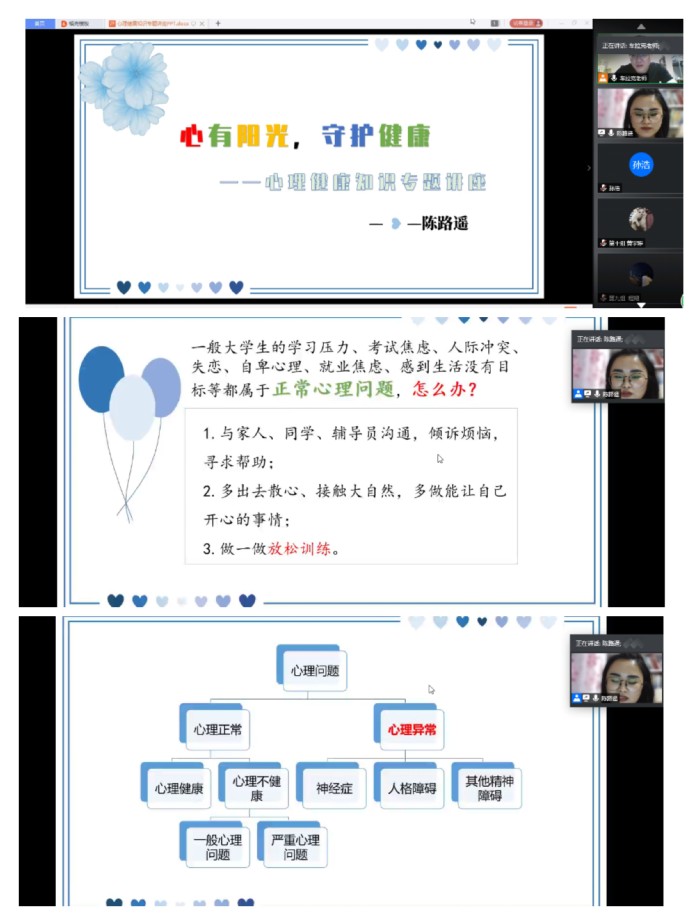 为了进一步提高学院全体学生的心理素质,充分开发他们的潜能,培养学生乐观、向上的心理品质,525日晚,学院“青马工程”培训班邀请“辅导员工作坊”心理健康教育组陈路遥老师做了“心有阳光,守护健康”心理健康教育专题讲座。本次讲座通过线上模式进行,共180余名培训班学员、团支部代表参加。