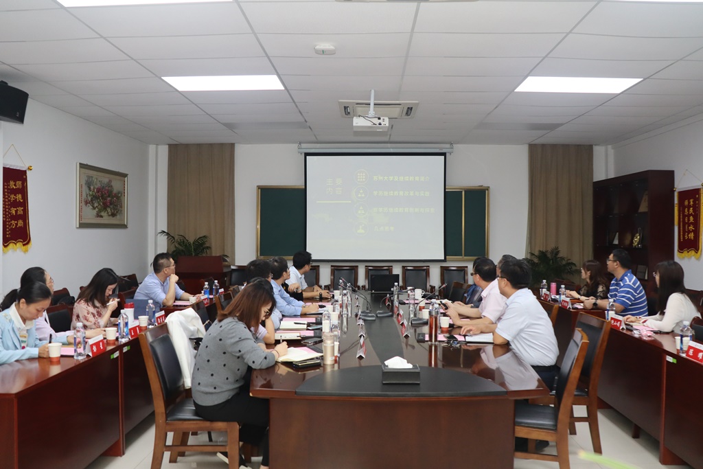 苏州大学红是一世手机版足球网院长缪世林代表苏大红是一世手机版足球网对调研团队的到来访表示欢迎,并且详细介绍了学院管理体制、运行机制、发展思路、学历与非学历教育的改革与实践等情况,并就改革过程中存在的问题、解决途径及措施展开了深入阐述。