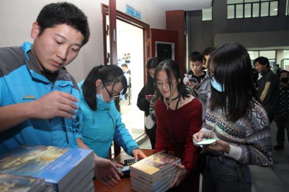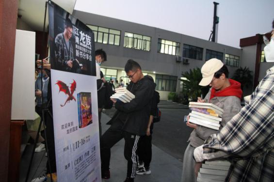 分享会开始前2个小时,13号楼报告厅就逐渐涌入了热情的读者粉丝,他们耐心地等待分享会的到来。据了解,有不少学生专门从将军路校区赶过来,天目湖不能到现场的学生,托同学购买书籍。这期间,摆在报告厅门口的新版《龙族》不断被买走,甚至有的学生一口气购买了十几本。