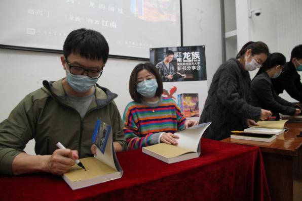主题报告结束后,便是激动人心的互动环节,江南抽取了同学们在便签墙上的留言表白进行解答。“十年青春,感谢有你,勿忘初心,坚守本心。”“亲眼见到江南,好激动!”“期待龙五的到来。”“楚子航什么时候兑现凯撒的一次承诺?”……报告厅里时不时传出热情的欢呼声和掌声。据了解,今年正好是《龙族》出版十周年,十年来,《龙族》斩获粉丝无数,陪伴着一个个少年成长为青年,《龙族》承载了青少年梦想,激励他们前行。虽然粉丝的热情难以抵挡,但是新版《龙族》签售现场秩序井然,同学们按照工作人员的安排,有序排队依次领取江南老师签售书籍,本次主题分享会圆满结束。