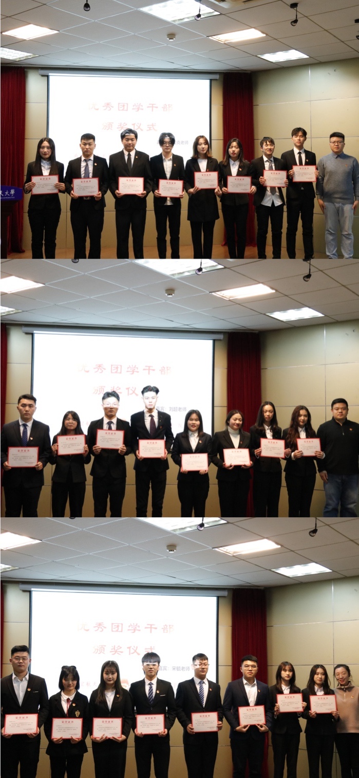 刘凯宣读学院《2019-2020学年团学组织表彰的决定》,学生工作主管宋毓、刘超,团委指导老师车拉克为2019届团学组织优秀学生干部代表颁发了荣誉证书。