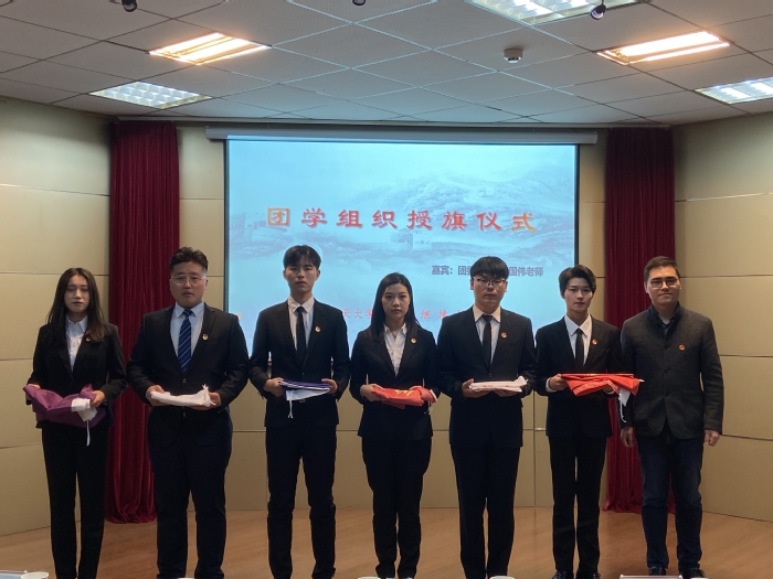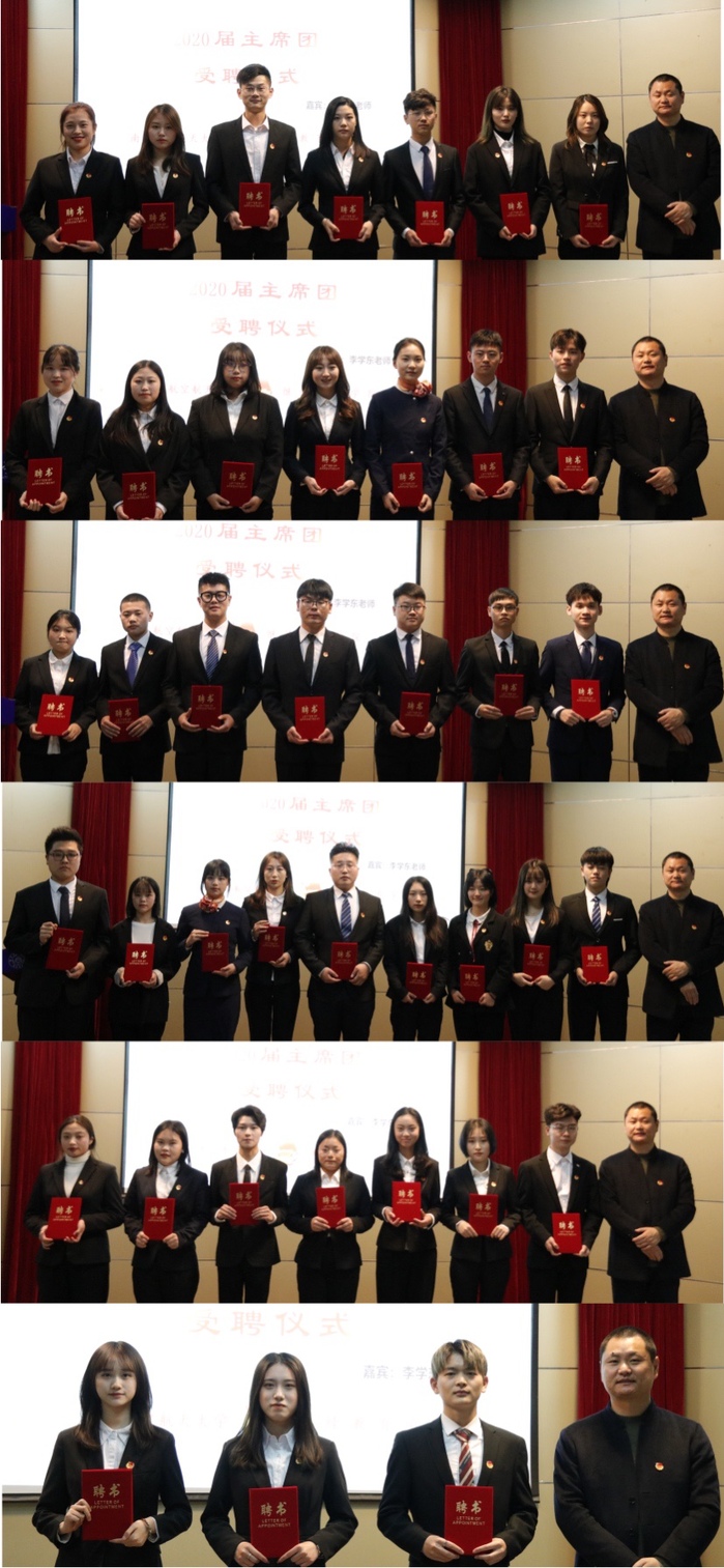 车拉克宣读学院2020届团学组织主席团任命文件,李学东为2020届团学组织主席团颁发聘书,邓国伟为团学组织负责人授旗。