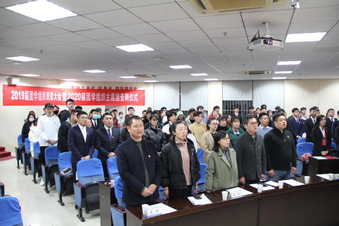 12319:00,学院2019届团学组织表彰大会暨2020届团学组织主席团受聘仪式在A12报告厅举行。来自学生会等六大团学组织的学生代表们迎来了新老交替、传承使命的时刻,学院党委副书记张晓燕、团委书记邓国伟、团委副书记李学东、学生工作主管宋毓、刘超,及团委指导老师、学生辅导员、各团学组织学生干部出席大会。