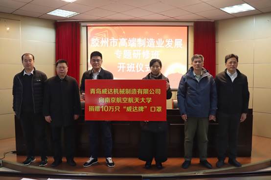 为密切胶州市和我校的合作关系,助力学校疫情防护工作,本期研修班的学员单位青岛威达机械制造有限公司向我校捐赠了10万只口罩。校医院陆晖副院长代表学校疫情防控工作组参加了捐赠仪式,并向青岛威达机械制造有限公司王大伟董事长颁发了捐赠证书。