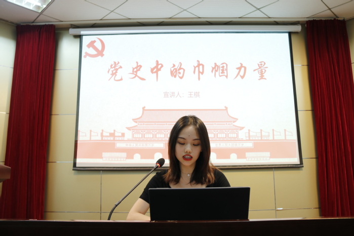 2021年6月4日,校党史宣讲团成员、马克思主义学院2020级硕士研究生王棋同学受邀为学院学生讲授题为《党史中的巾帼力量》主题党课。