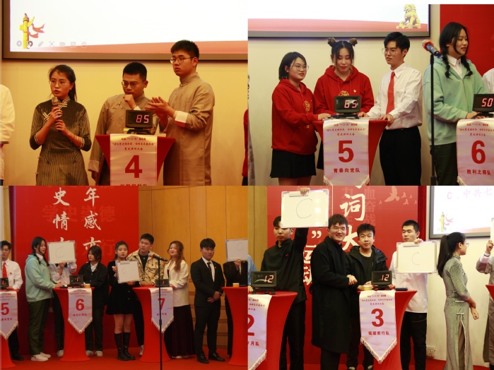 在党史知识答题部分,8支参赛队伍通过“眼疾手快、头脑风暴、巅峰对决”三种题型的现场知识竞答,考验了参赛同学对党史知识、党史诗词及党的基本理论等方面的理解与掌握,通过抢答、必答、论述等答题形式,充分调动了全场师生对党史学习的热情,重温了对红色经典文化的记忆,促使党史知识入脑入心、走深走实。