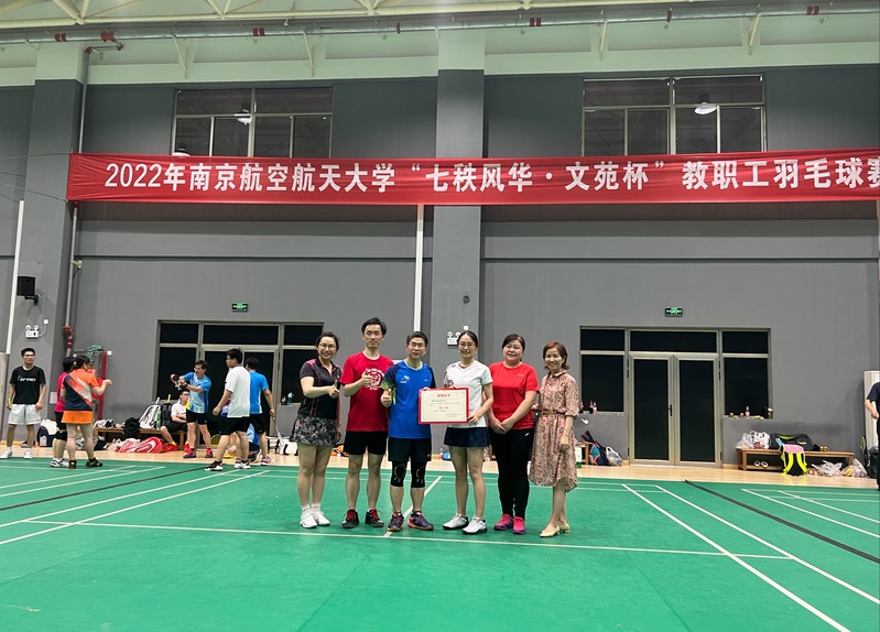 6月13-17日,由校工会主办,图书馆和体育部协办的2022年我校”七秩风华.文苑杯”教职工羽毛球赛在将军路校区体育馆举行。由王伟、郑骏、尹春苹、王娅、黄山五人组成的学院羽毛球队参加比赛并荣获第二名。