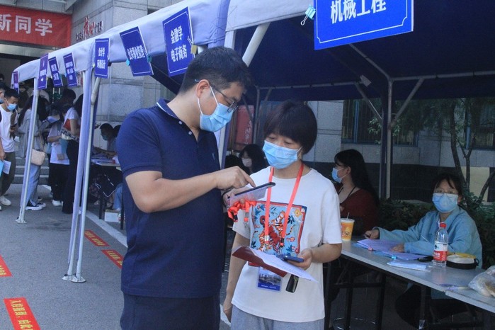 本次新生报到采取“一站式服务”的方式,工作人员和志愿者们各司其职、通力合作。迎新的志愿者们,早早等待着每一个新生的到来,两码核验、核酸检测、体温测量,在疫情期间,每一道程序都严格的执行,只为保障每一个新生的健康和安全。各个岗位的志愿者们分工明确,张贴行李标签、现场引导、搬运行李,志愿者们热情积极,详细解答新生的疑问,确保新生顺利报到。学院工作人员耐心讲解报到事项,收集报到信息,细致办理各项流程,保证新生报到的各个环节高效衔接、有条不紊。一个热情的微笑、一份贴心的服务、一句暖心的问候,让刚刚走进校园的新生倍感亲切。