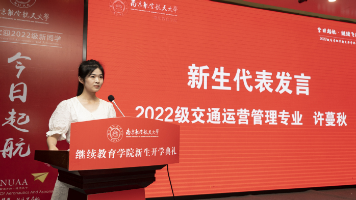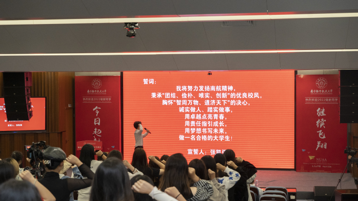 典礼上,学院领导和嘉宾为新生代表佩戴校徽,宣告新生正式成为一名南航人。新生代表张凯强同学上台领誓,现场同学们举起右拳,发出了作为南航学子的铿锵誓言。2022级交通运营管理专业许蔓秋作为新生代表发言,她表示,要在南航的大学生涯中,进一步坚定理想信念、坚持勤奋刻苦、积极融入校园,做一个合格的南航人。