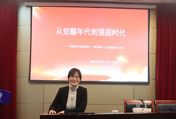 董金平从“时代:一路走来,从觉醒到强国”、“对比:时代差异,内外环境发生变化”、“工作:遭遇挑战,青年工作的困难与方向”三个方面详细阐述中国青年在党和人民最需要的时刻冲得出来、顶得上去,展现出自信自强、刚健有为的精神风貌。她强调新时代青年工作的方向是给青年以信心,给青年以希望,给青年施展自己的舞台,做好青年的知心人、热心人和引路人,让中国青年创造更加美好的中国特色社会主义新时代。