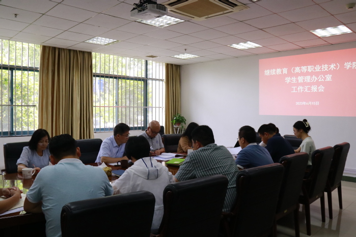 在学院立足转型发展的重要阶段,为深入学习贯彻习近平新时代中国特色社会主义思想主题教育,有效促进主题教育在学院学生教育管理工作中落细落实,进一步找准学生工作重点、疏导堵点,统一思想、凝聚共识,6月15日,学院召开学生工作汇报研讨会,全体院领导、学生管理办公室相关人员参加了会议。