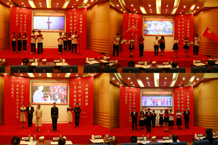 经过前期初赛,进入朗诵决赛的8支队伍,紧紧围绕习近平新时代中国特色社会主义思想展开了《新时代新征程,绽放青春之花》《青春向党,筑梦华章》《文化兴国运兴,文化强民族强》等精彩主题朗诵,参赛同学们激情满怀、神采奕奕、声情并茂,一篇篇催人奋进的朗诵原创、一曲曲高亢激昂的背景音乐、一幕幕有声有色的情景再现……在他们铿锵有力、饱含深情的朗诵声中,歌颂着党的十八大以来,以习近平同志为核心的党中央为中国人民谋幸福、为中华民族谋复兴的故事,彰显了新时代青年的使命与担当,抒发了学院师生对党、对祖国的深厚情感,表达了“请党放心,强国有我”的豪情壮志。