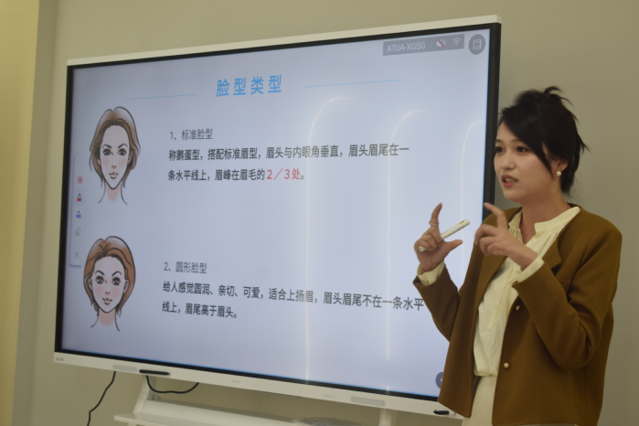 曹靓老师讲授内容主要分为化妆技巧分享、化妆实践体验、常见问题答疑三个部分。化妆技巧分享环节,她讲解常见脸型分析底妆、眼妆、腮红、高光、修容和唇部画法;化妆实践体验环节,现场邀请同学作为模特,向师生们直观展示化妆步骤及技巧;问题答疑环节,针对师生们提出“怎么化素颜妆”等问题她用自身实践与所学答疑解惑,提供合理建议。