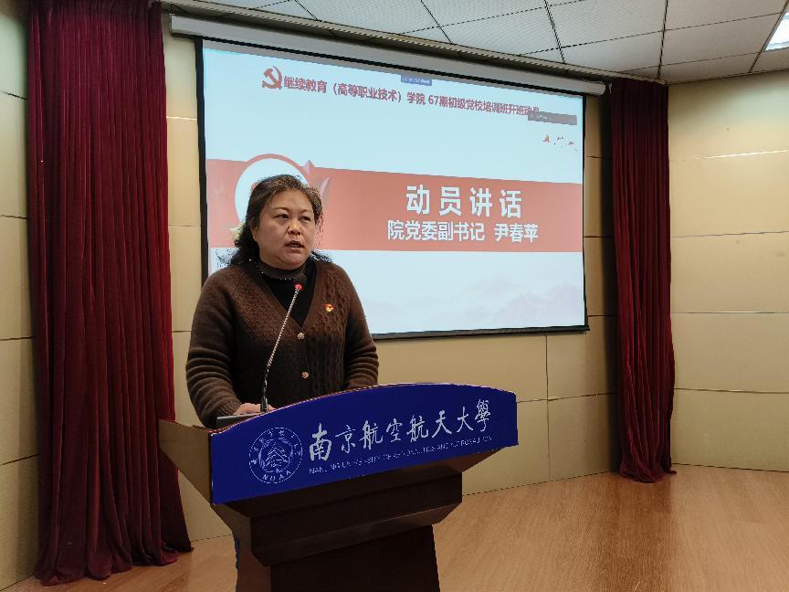 尹春苹作动员讲话。她从端正态度、端正动机、树立目标三个方面对同学们的学习提出期望和要求,她指出今年是新中国成立75周年、也是我国实现“十四五”规划目标任务的关键一年,希望大家通过培训接受系统的党的基本理论、基本知识和党的基本路线教育,清楚了解党的的性质、指导思想、宗旨、任务等,牢记党员权利和义务,进一步端正入党动机,也希望学生们用科学理论武装头脑,坚持理论与实际相结合,坚持学以致用,求真务实、脚踏实地,在大学这个人才辈出的大熔炉里不仅成长为合格的大学生,也成长为一名名副其实的共产党员。