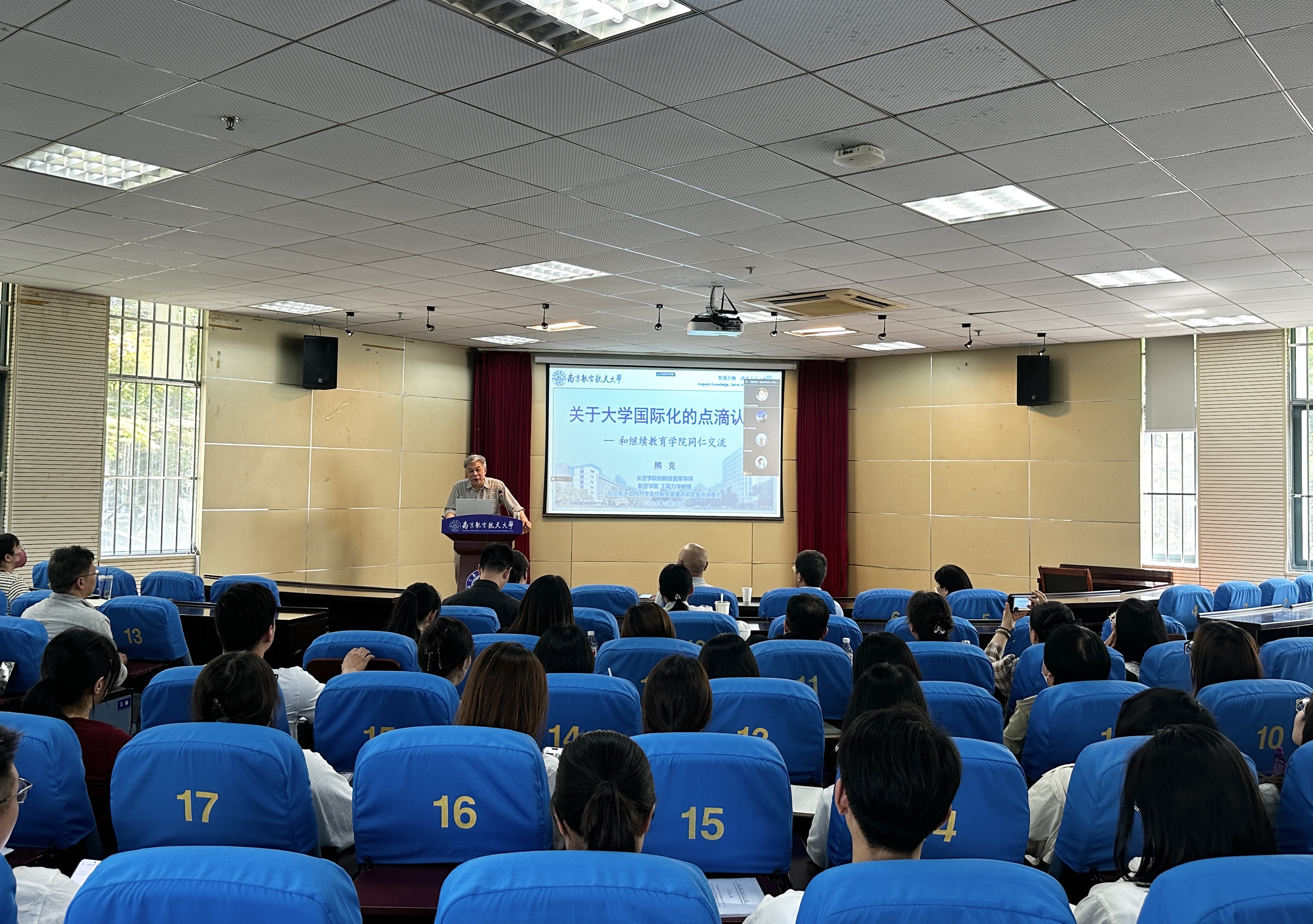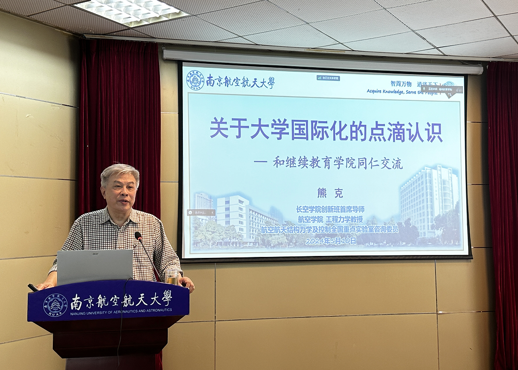 熊克的专题讲座围绕教育的国际化、大学的基本认识、现代大学使命的演化、大学国际化特征、大学国际化的评价、继续教育、终身教育等方面展开。他根据自己对人才培养国际化的探索和研究,为大家剖析了继续教育拥有办学灵活、针对性强、见效快、与社会需要和学习者职业发展联系紧密等特点,有着培养国际化人才的优势和机遇。他着重介绍了,学校近年来综合实力显著提升,办学声誉不断增强,继续教育领域也要放眼国际教育发展形势,加强继续教育在国际上的影响;要加强与各国的人文交流和学术交流,扩大办学知名度和国际影响力。他指出,大家要持续不断的学习,了解前沿,追赶前沿,将继续教育往多元化、创新化、品牌化、信息化、个性化、质量化的方向发展,要打造南航自己的继续教育品牌,对社会做出更大的贡献。
