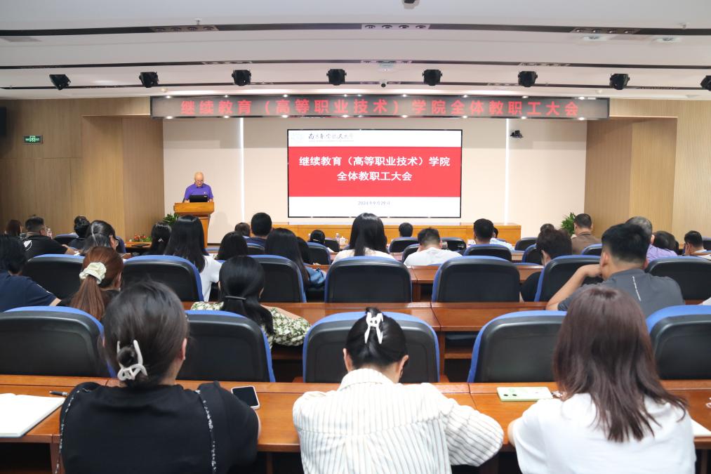 为深入学习贯彻党的二十届三中全会精神,加快推进学院转型与高质量发展,9月29日,继续教育学院召开2024年下半年教职工大会,学院领导班子和全体教职工参加会议。会议由学院党委书记刘建成主持。