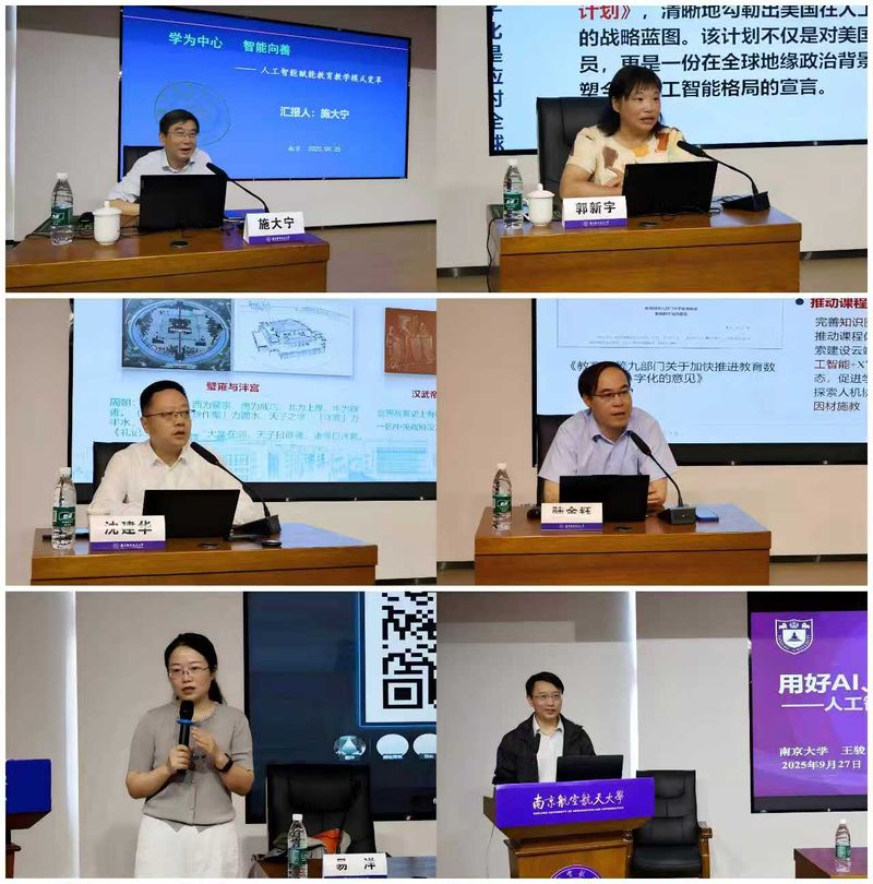 本次培训特邀多位在人工智能与教育融合领域具有深厚造诣的专家学者授课。我校施大宁教授以“学为中心-智能向善”为主题,深入阐释了人工智能赋能教育教学模式变革的路径与思考;江苏省教育厅高教处郭新宇调研员从政策层面出发,系统介绍了人工智能赋能高等教育的探索与实践;南京邮电大学沈建华教授结合学校办学定位,分享了建设人工智能通识课程的宝贵经验;东南大学陆金钰教授对未来实验教学模式改革提出了前瞻性思考;我校易洋副研究员探讨了AI赋能教师能力提升的有效路径;南京大学王骏教授则分享了南京大学在人工智能融合教育方面的创新实践。