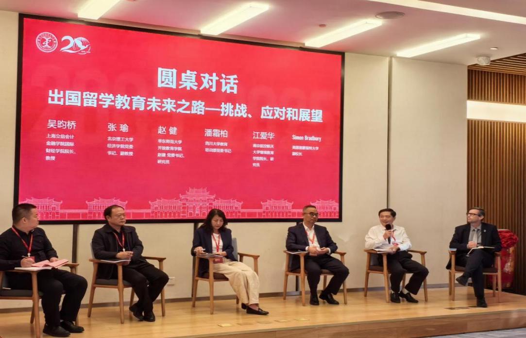 圆桌对话以《出国留学教育未来之路——挑战、应对和展望》为主题,上海立信会计金融学院国际财经学院院长吴昀桥主持,英国德蒙福特大学副校长Simon Bradbury、北京理工大学经济学院党委书记张瑜、华东师范大学开放教育学院党委书记赵健、四川大学教育培训部党委书记潘霜柏、以及我院院长江爱华参加对话研讨。对话嘉宾从宏观到微观角度畅谈了在后疫情时代,全球高等教育治理、数字化转型等变革加速演进形势下,出国留学教育实践过程中遇到的问题、对策及寄望。江爱华在圆桌对话中谈到,当前出国留学教育正面临全球化退潮、政策波动与技术革命的叠加冲击,我校通过一体化运行破局,重构了“三横三纵”国际合作体系,坚持自招、自办、自管不动摇,探索出一条“资源整合—服务升级—生态共建”的路径。未来的留学教育需进一步向“价值创造”转型,通过产学研深度融合、数字化服务升级、全球教育治理参与,以学生发展为核心重构国际教育生态。